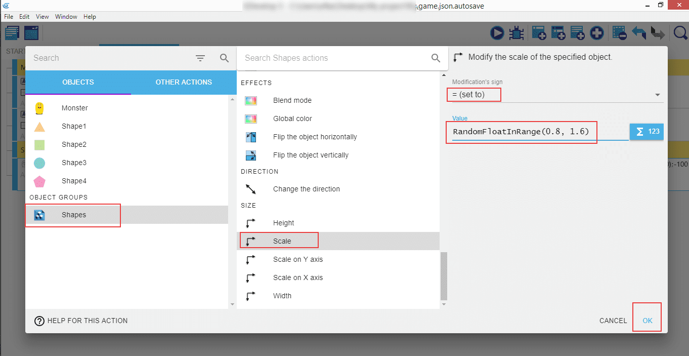 Click on "Shapes", then look for "Scale", select = (set to) and enter RandomFloatInRange(0.8, 1.6). This will customize our shapes even more by introducing random scaling - some of them will be a little bit smaller than the original (80% of the original), and some will be bigger (160%).